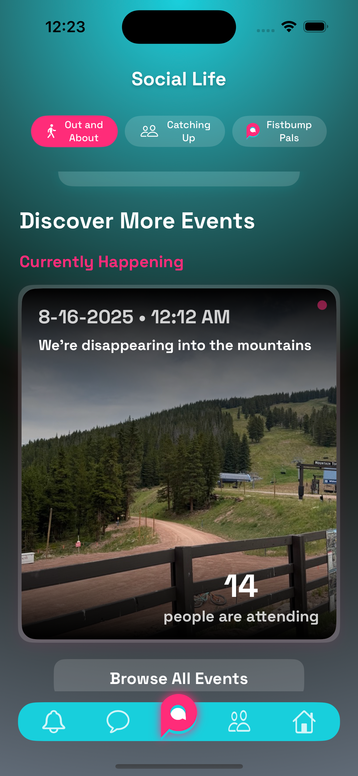 Whereas other social media apps have an ‘explore’ page, we have a ‘social life’ page. The key difference is that the core of our app is based in the real world. On this page, you can browse events created by other users or make your own (public or private).